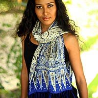NOVICA Silk batik scarf, 'Royal Java Blue'